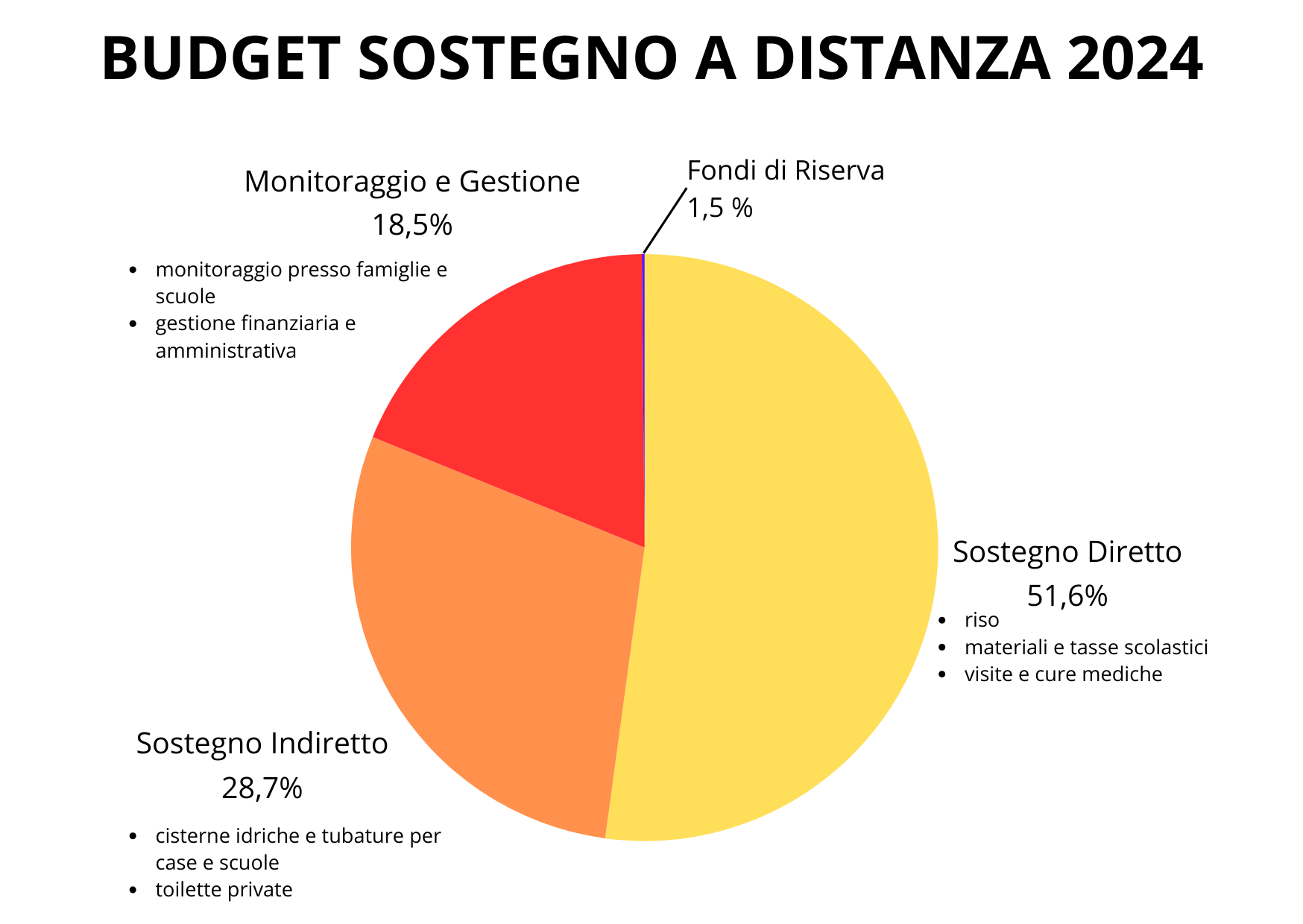 Nell'immagine seguente, potrete vedere come è allocato il budget del programma Sostegno a Distanza per l'anno 2024, per varie categorie di spesa.