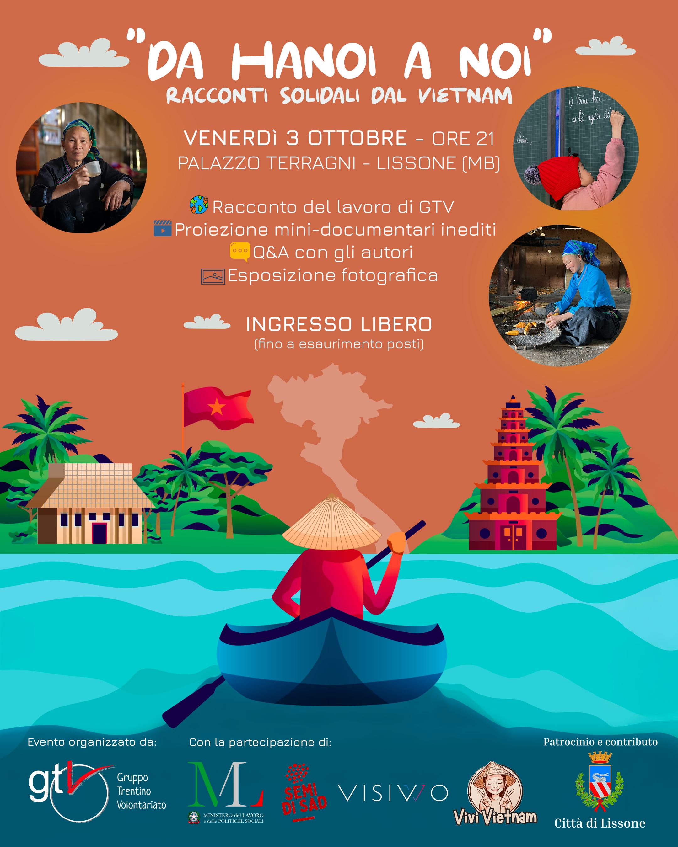 Durante la serata saranno proiettati tre mini-documentari realizzati dai videomaker e volontari di GTV, Jacopo d’Ambrosio e Anna Mariani, che nella primavera 2025 hanno visitato il distretto di Xin Man per conoscere da vicino e raccontare il nostro programma di Sostegno a Distanza (SAD). Jacopo e Anna condivideranno con noi, in prima persona, la loro esperienza di viaggio e di volontariato in Vietnam. Verrà anche allestita una piccola mostra fotografica. Sarà un’occasione unica per riflettere insieme sui temi della cooperazione internazionale e sul valore del programma SAD, oltre che un momento di scambio e confronto con la comunità.