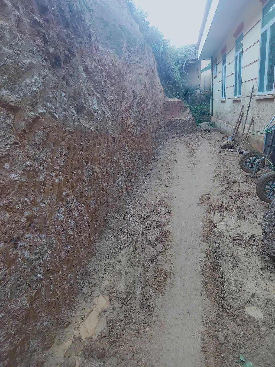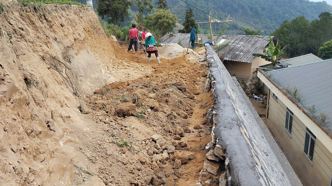 Thanks to the project “Response to the Climate Emergency and Typhoon YAGI in Xin Man District”, GTV was able to construct a retaining wall to secure the school and prevent future landslides. Work began in February 202: the rear soil was excavated to prevent future slippages, and the mountainous terrain was subsequently reinforced with a concrete retaining wall and a drainage ditch.