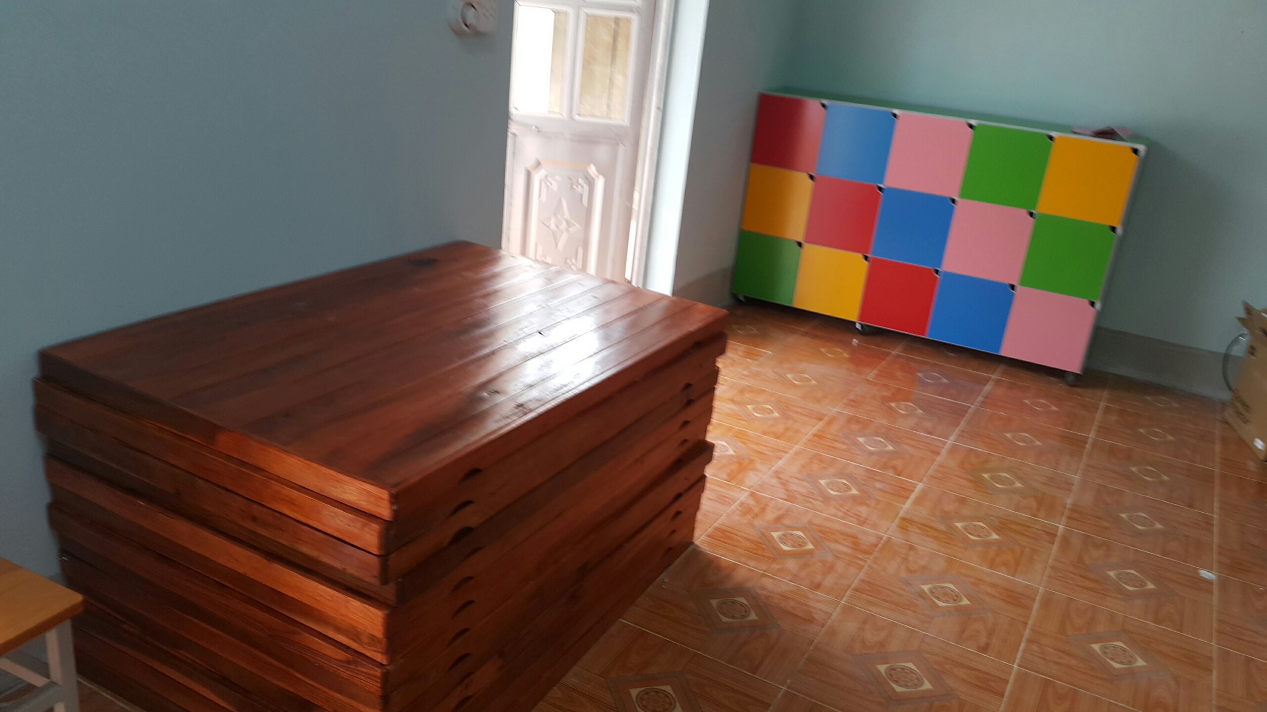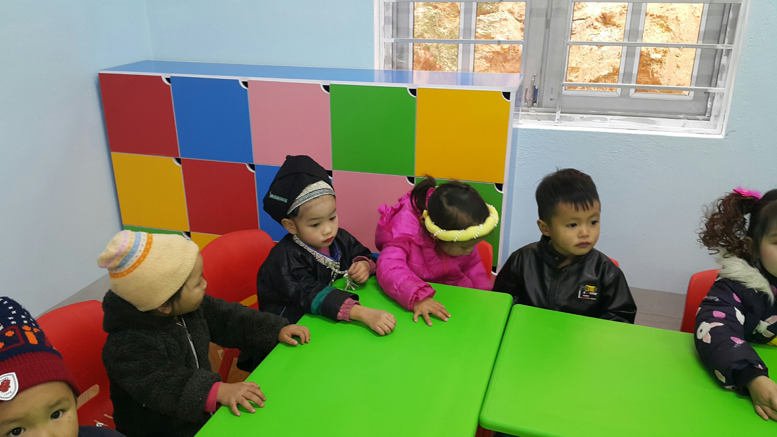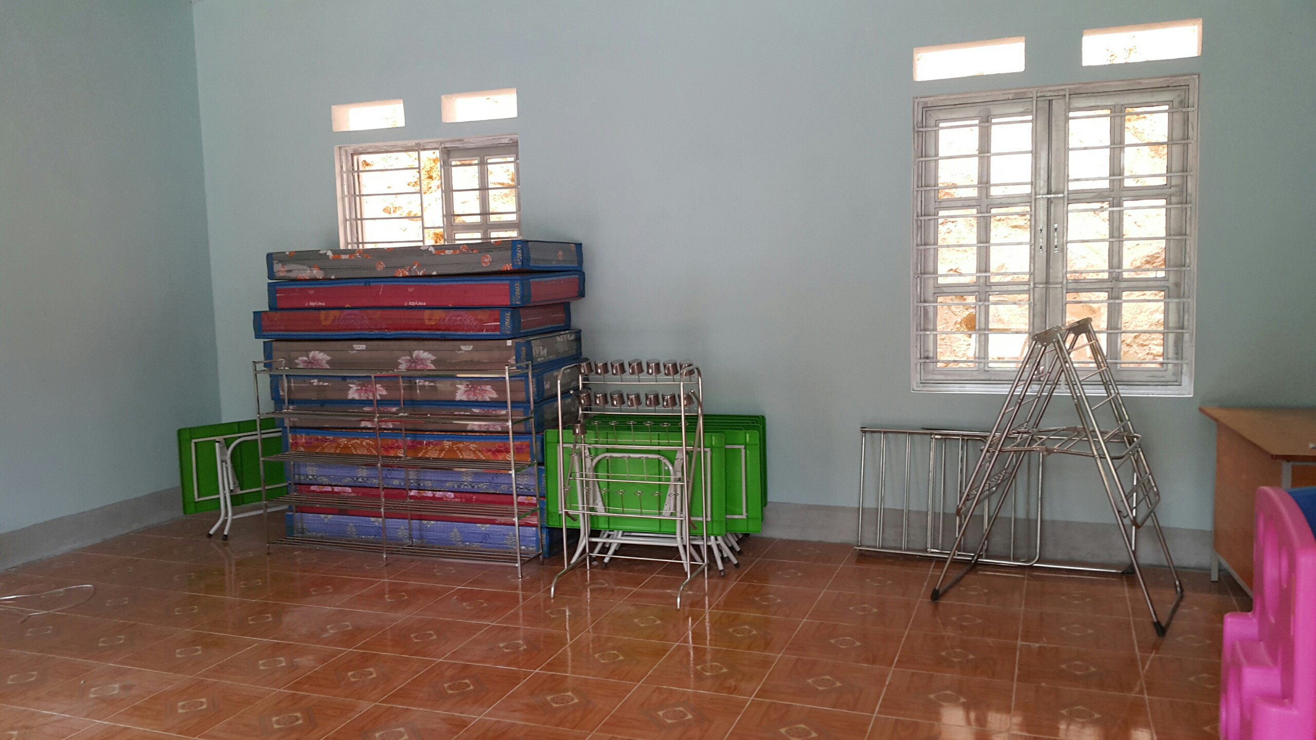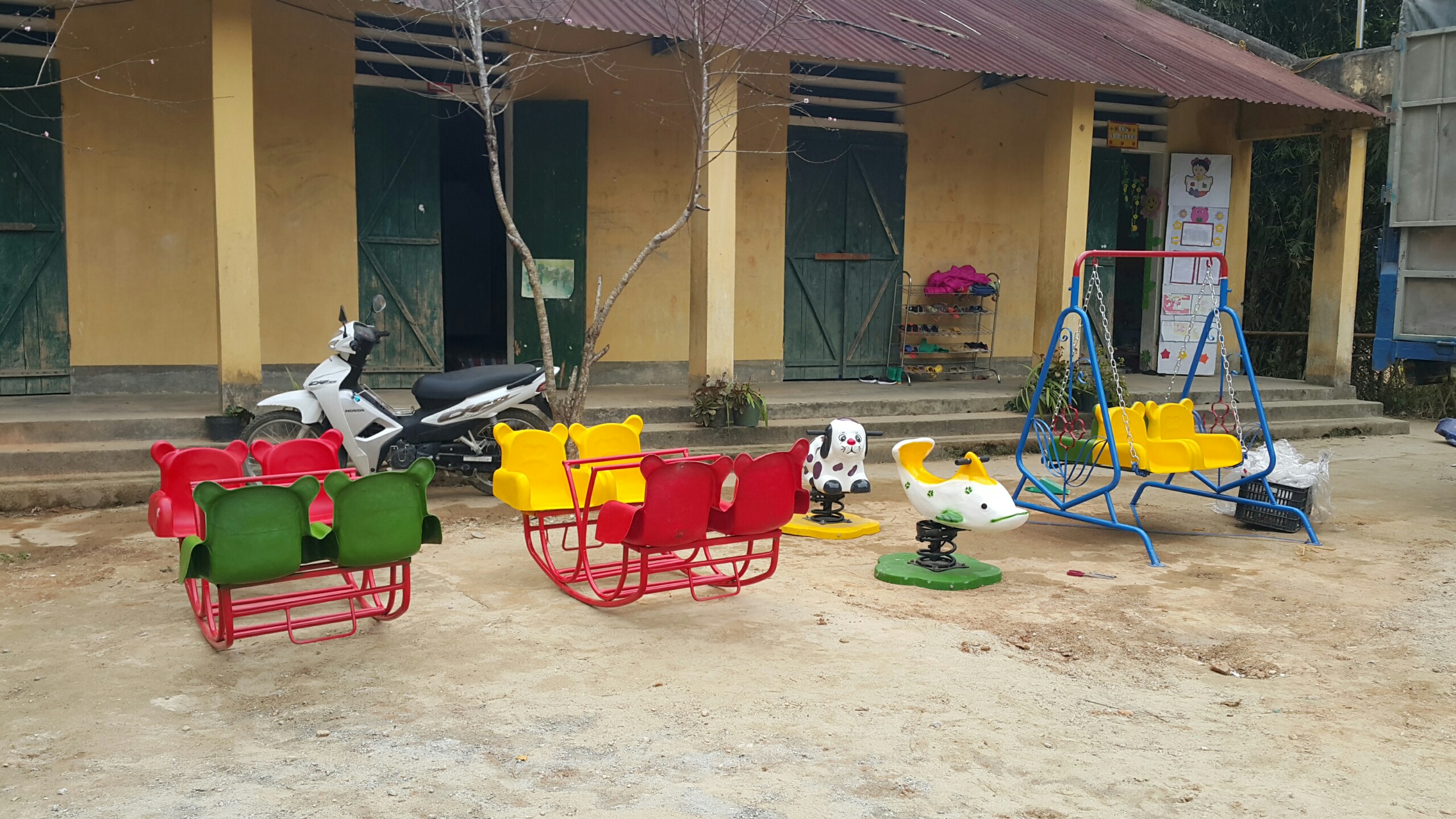 Inoltre, si sono forniti nuovi arredi adatti all'età dei piccoli alunni, come tavoli, armadietti, sedie e materassi, nuovi strumenti utili alla vita quotidiana della scuola, come tazze, libretti e giochi, e anche giochi da cortile, come l'altalena e il dondolo.