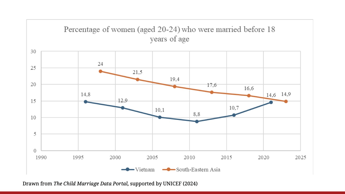 Finally, for what concerns Vietnam in general, the Master's thesis shows how in the country the amount of girls married before 18 is steadily increasing. Notwithstanding the massive economic growth and improvements in other areas concerning gender equality, Vietnam represents an exception to South-East Asia, with a rate in a persistent increase. This practice is more widespread among the ethnic minorities more isolated and vulnerable of the country. It is clear, therefore, the necessity of keeping further interventions, so that Vietnamese boys and girls can continue their educational path while offering them information on the risks regarding early marriages and pregnancies.